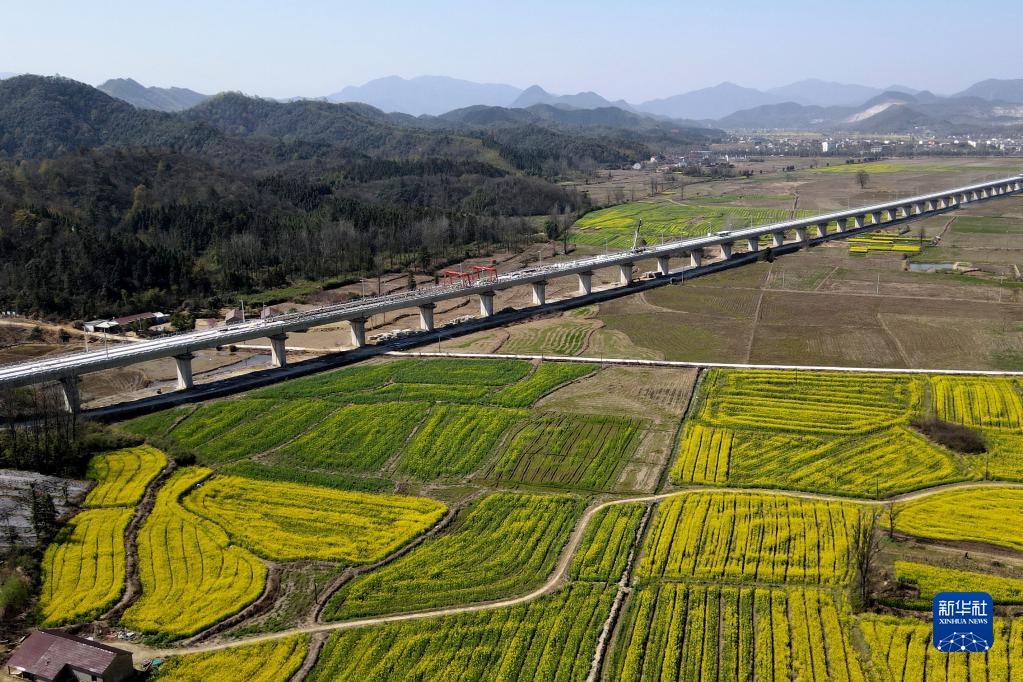 這是3月14日拍攝的中鐵十一局池黃鐵路無(wú)砟軌道施工現場(chǎng)(無(wú)人機照片)。