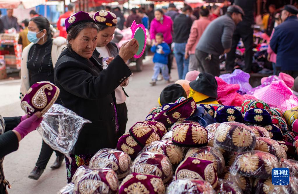 人們在新疆莎車(chē)縣的綜合巴扎上選購花帽(3月12日攝)。