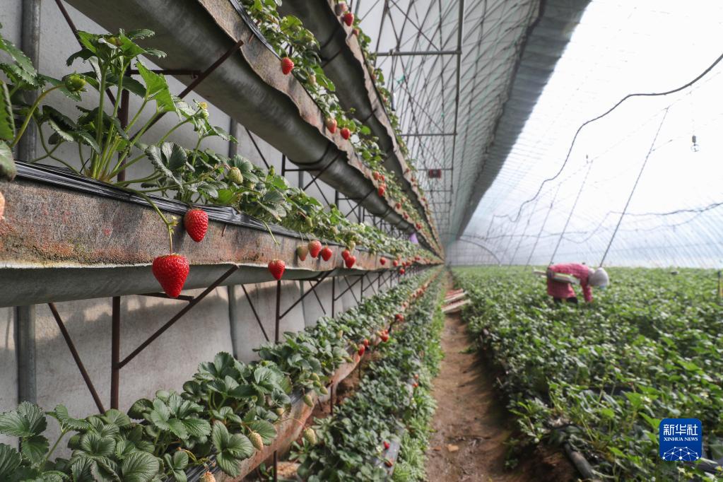 3月14日,村民在岫巖縣洋河鎮的草莓大棚采摘草莓。