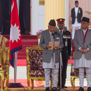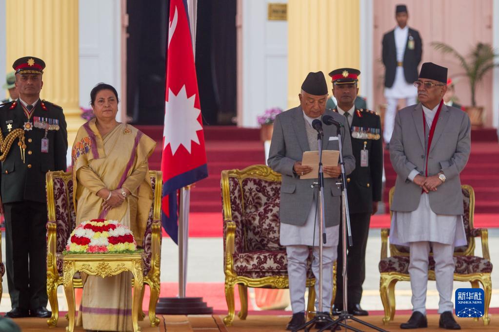 3月13日,尼泊爾總統拉姆·昌德拉·鮑德?tīng)枺ㄇ坝遥┰诩拥聺M(mǎn)都參加就職儀式。尼泊爾當選總統鮑德?tīng)?3日宣誓就職。