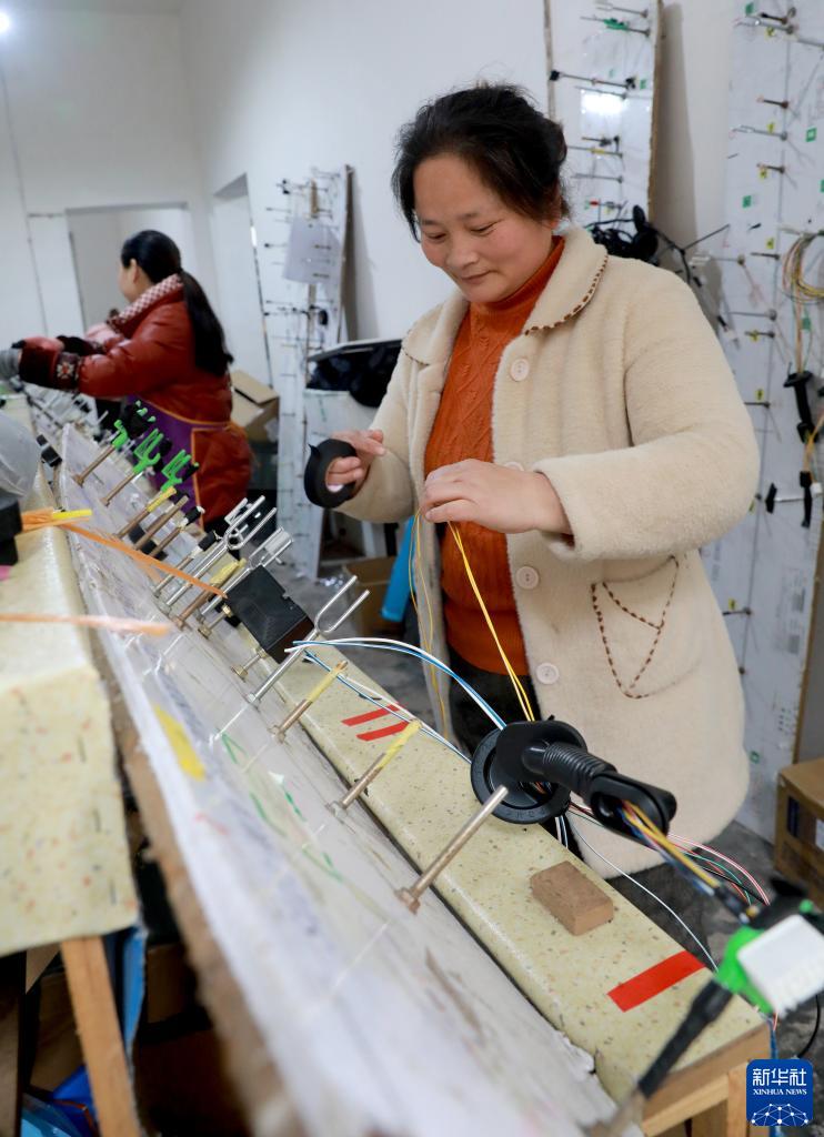 3月14日,四川省華鎣市明月鎮汽車(chē)配件“微車(chē)間”里,女工在纏繞汽車(chē)線(xiàn)束。