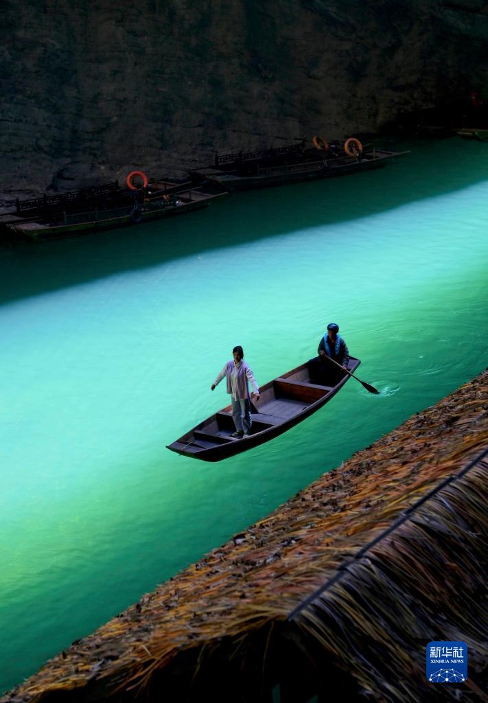 湖北省恩施土家族苗族自治州鶴峰縣容美鎮屏山村屏山旅游景區河水清澈見(jiàn)底,舟行水上如懸浮空中,美如畫(huà)卷。