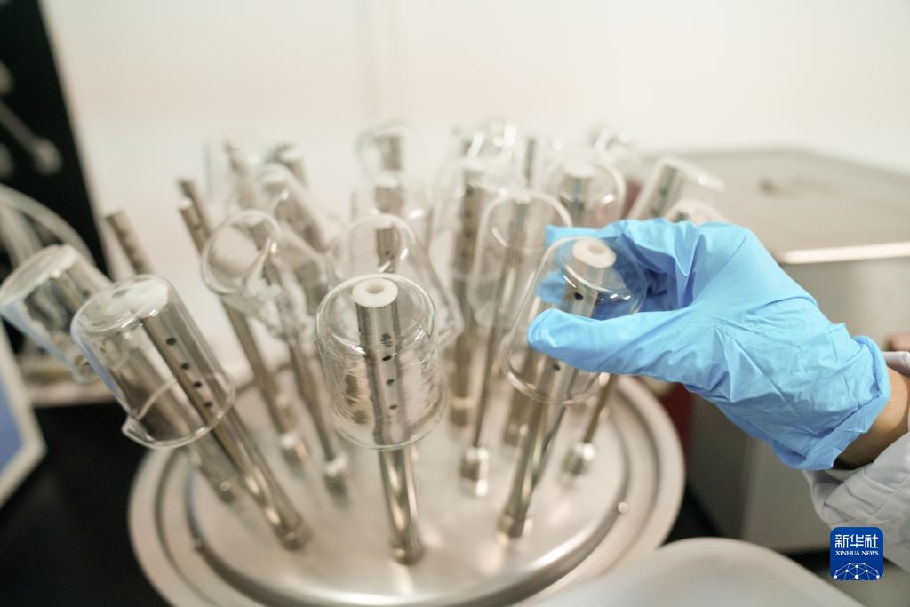 3月14日,在北大荒集團建設農場(chǎng)有限公司農業(yè)科技園區土壤化驗室,孫凡紅將玻璃容器烘干。