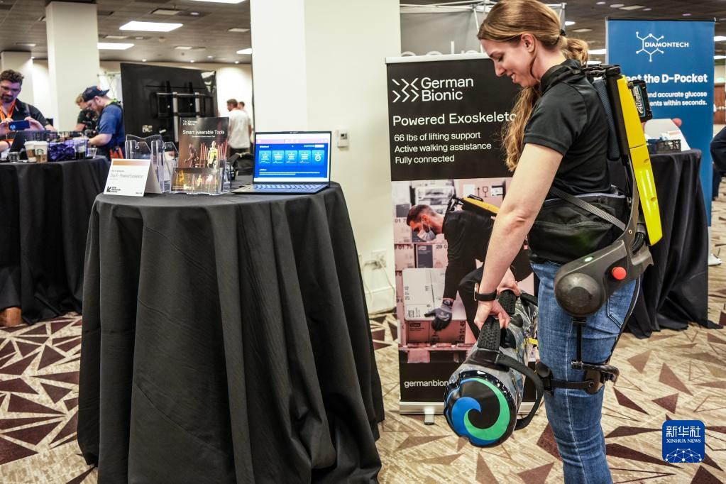 3月11日,在“西南偏南”大會(huì )和藝術(shù)節上,一位參與者正在體驗“仿生外骨骼”,它可以保護人體并幫助人們舉起重物。