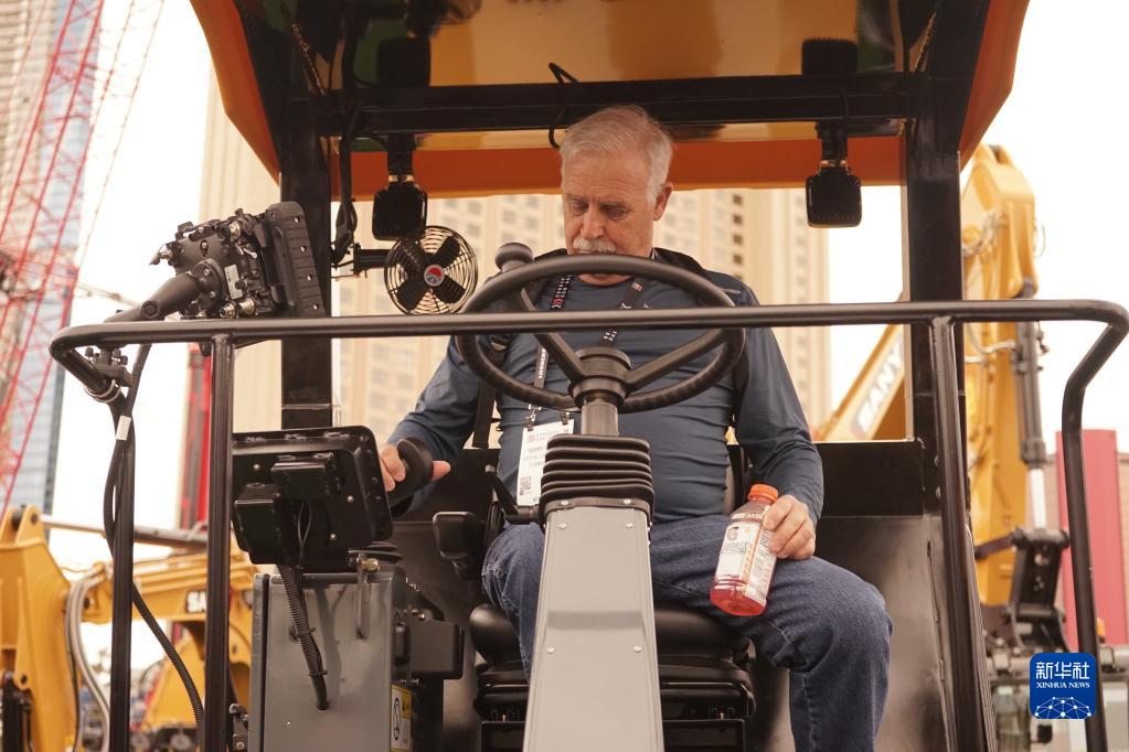 3月14日,一位參觀(guān)者在拉斯維加斯工程機械展上試駕中國企業(yè)三一重工的設備。