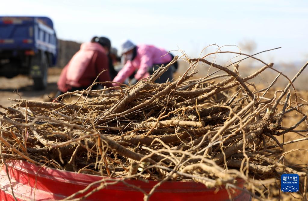 3月15日,在河北省石家莊市行唐縣上閆莊鄉中藥材種植基地,農戶(hù)在采收黃芩。