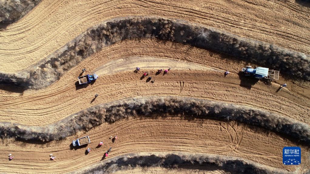 3月15日,在河北省石家莊市行唐縣上閆莊鄉中藥材種植基地,農戶(hù)在采收黃芩(無(wú)人機照片)。