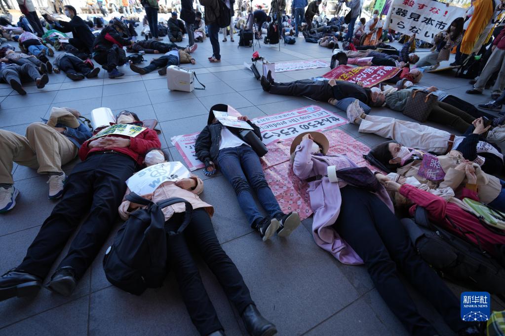 3月15日,民眾在日本千葉縣幕張會(huì )展中心門(mén)前抗議。