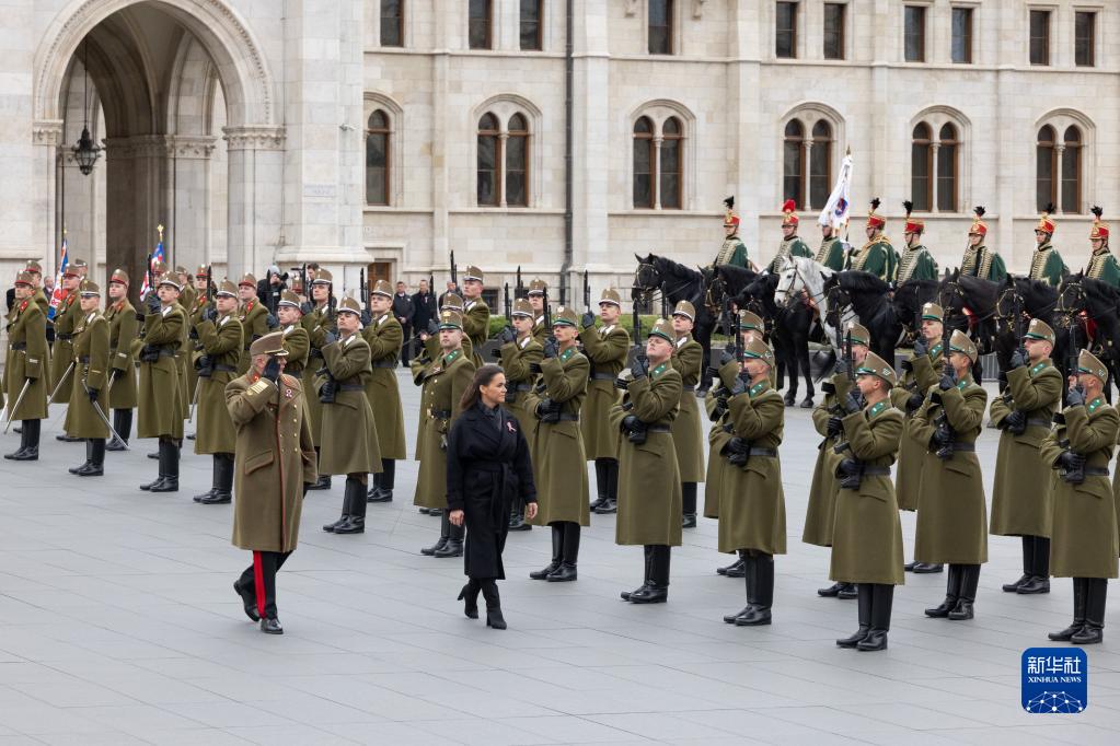 3月15日,在匈牙利布達佩斯國會(huì )大廈前的科蘇特廣場(chǎng),匈牙利總統諾瓦克·卡塔琳在升國旗儀式上檢閱儀仗隊。