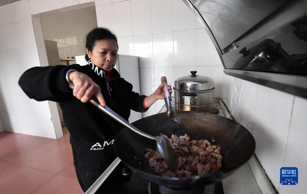 廣西金秀瑤族自治縣忠良鄉山界教學(xué)點(diǎn)的教師陶鳳英給學(xué)生炒菜做營(yíng)養午餐(3月15日攝)。