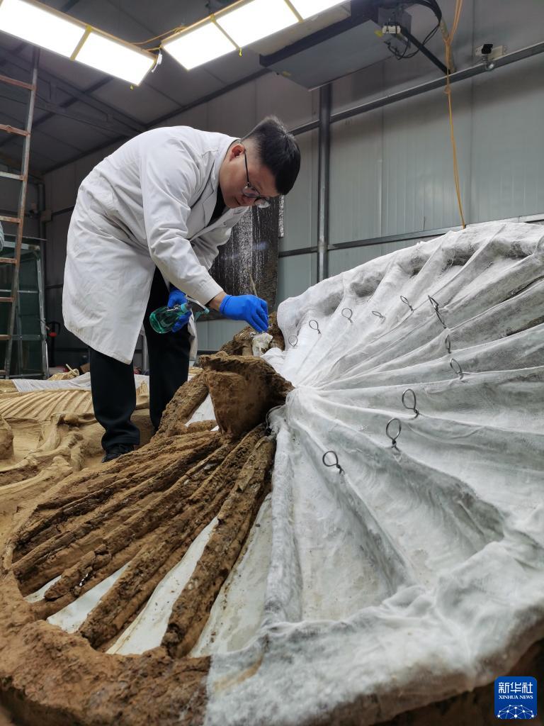 3月16日,在河北行唐故郡遺址考古實(shí)驗室,工作人員在對二號車(chē)馬坑的3號車(chē)進(jìn)行清理。
