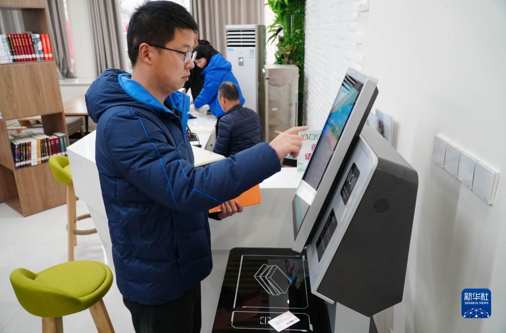 3月16日,在山東省菏澤魯西新區岳程街道,一名居民在“牡丹書(shū)房”通過(guò)自助借閱機完成圖書(shū)借閱。