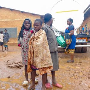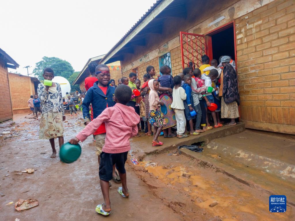 3月16日,在馬拉維布蘭太爾,一些災民兒童在一所小學(xué)內的臨時(shí)安置營(yíng)地領(lǐng)取早餐。