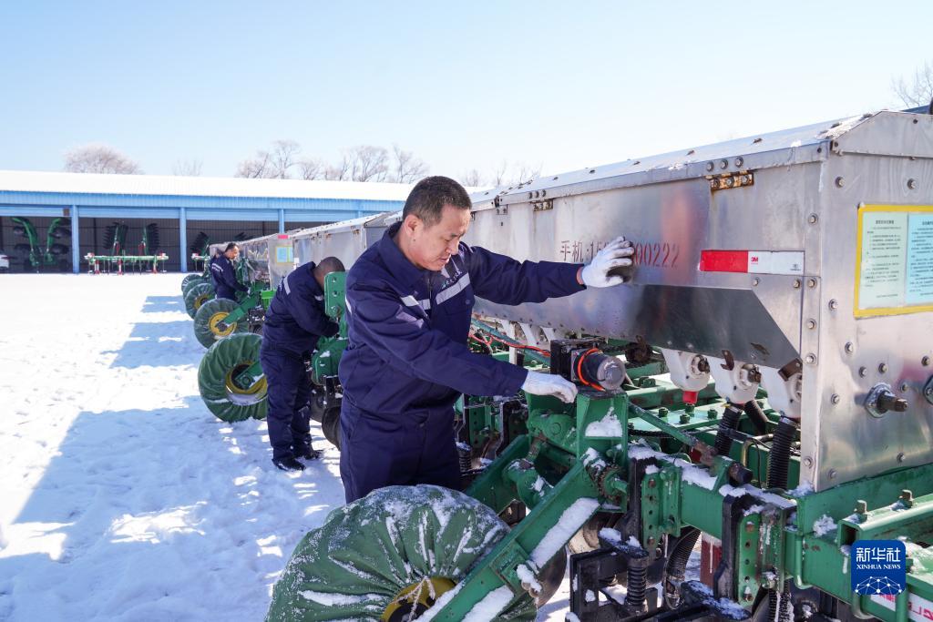 3月16日,在北大荒集團建設農場(chǎng)有限公司第四管理區,農機技術(shù)員在檢修農機具。