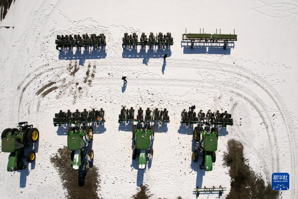 3月16日,在北大荒集團建設農場(chǎng)有限公司第四管理區,農機技術(shù)員在檢修農機具(無(wú)人機照片)。