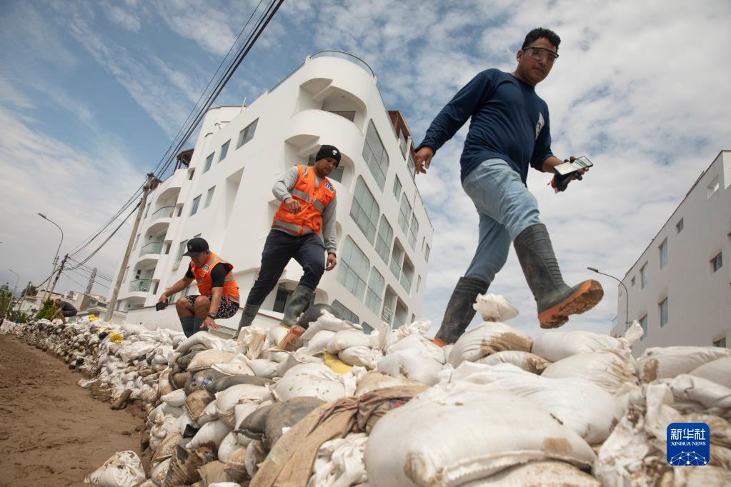 3月16日,在秘魯首都利馬南部的蓬塔赫爾莫薩地區,人們走在為阻擋泥石流而建造的臨時(shí)堤壩上。