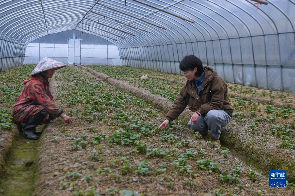3月17日,陳萍梅(右)在位于清涼峰鎮頰口村的家庭農場(chǎng)里查看農作物長(cháng)勢。