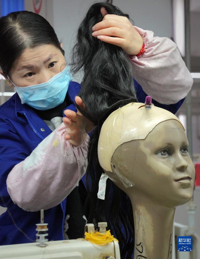3月16日,工作人員在河南瑞貝卡發(fā)制品股份有限公司的生產(chǎn)車(chē)間里制作假發(fā)。