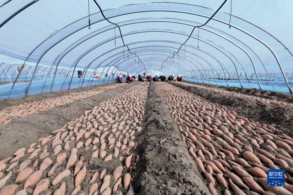 3月17日,灤南縣東黃坨鎮紅薯種植專(zhuān)業(yè)合作的社員在往育苗床上擺放紅薯種薯。