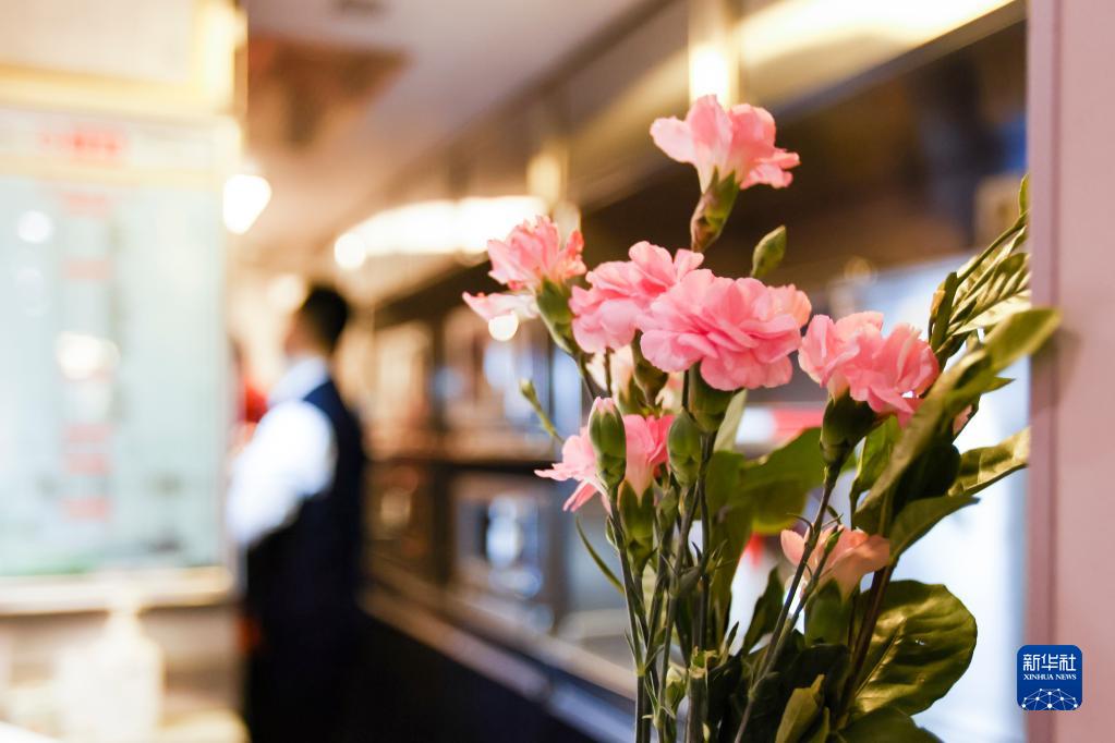 3月17日在首趟“杏花號”高鐵列車(chē)車(chē)廂內拍攝的裝飾品。