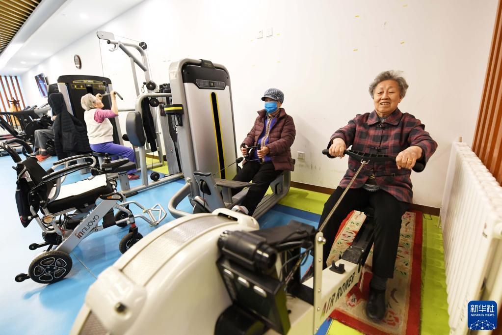 3月17日,三河市燕達金色年華健康養護中心的入住老人在健身房訓練。