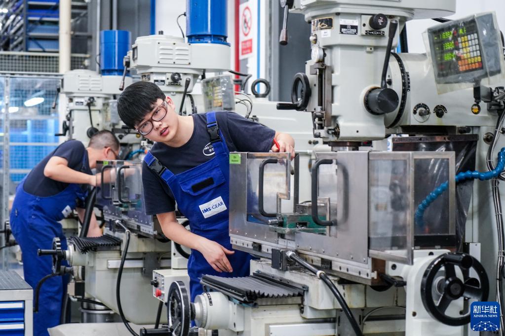 在位于太倉市高新區的億邁齒輪(太倉)有限公司學(xué)徒車(chē)間內,學(xué)徒在學(xué)習了解生產(chǎn)設備(3月14日攝)。