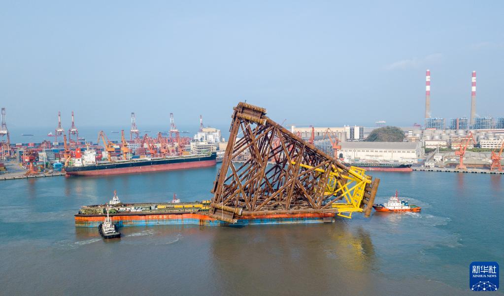 3月17日,在深圳赤灣海洋工程碼頭,“海洋石油228”運輸駁船搭載著(zhù)恩平20-4平臺導管架啟航(無(wú)人機照片)。