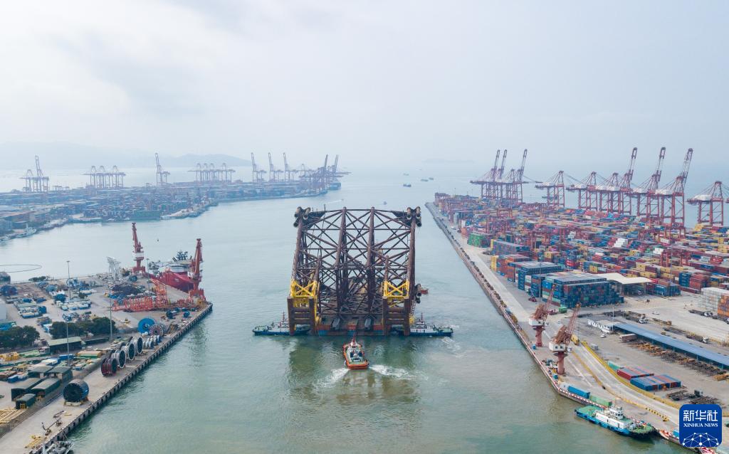 3月17日,在深圳赤灣海洋工程碼頭,“海洋石油228”運輸駁船搭載著(zhù)恩平20-4平臺導管架啟航(無(wú)人機照片)。