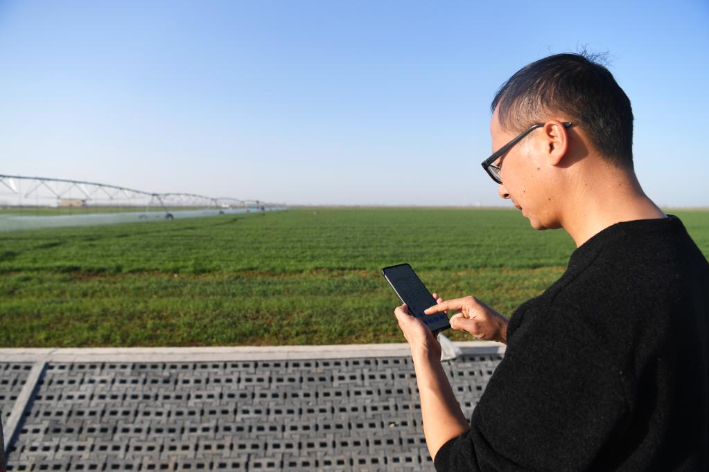 3月14日,在西平縣老王坡高標準農田示范區,劉亞輝通過(guò)手機遠程操控平移式水肥一體化噴灌機。