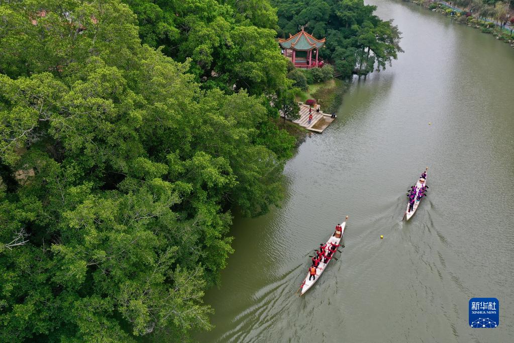 3月18日,福州流花溪上參賽龍舟隊在奮勇?tīng)幭龋o(wú)人機照片)。
