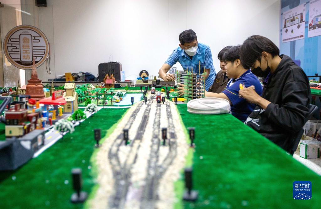 3月14日,在泰國大城府大城技術(shù)學(xué)院魯班工坊鐵院中心,教師(左一)在高鐵運營(yíng)沙盤(pán)教學(xué)區指導學(xué)生。