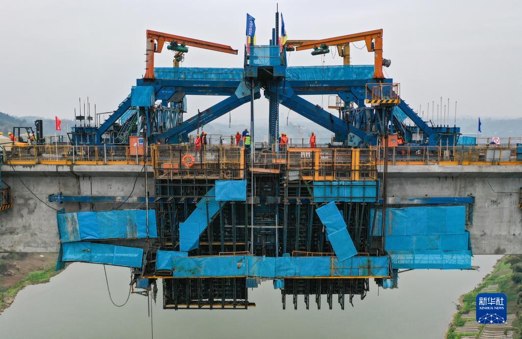 3月18日,施工人員在位于四川省瀘州市的渝昆高鐵瀘州沱江特大橋主跨合龍施工現場(chǎng)工作(無(wú)人機照片)。
