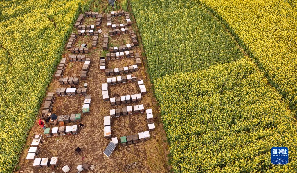 漢中市洋縣洋州街道何家村的村民在油菜花海中養蜂(無(wú)人機照片,3月16日攝)。