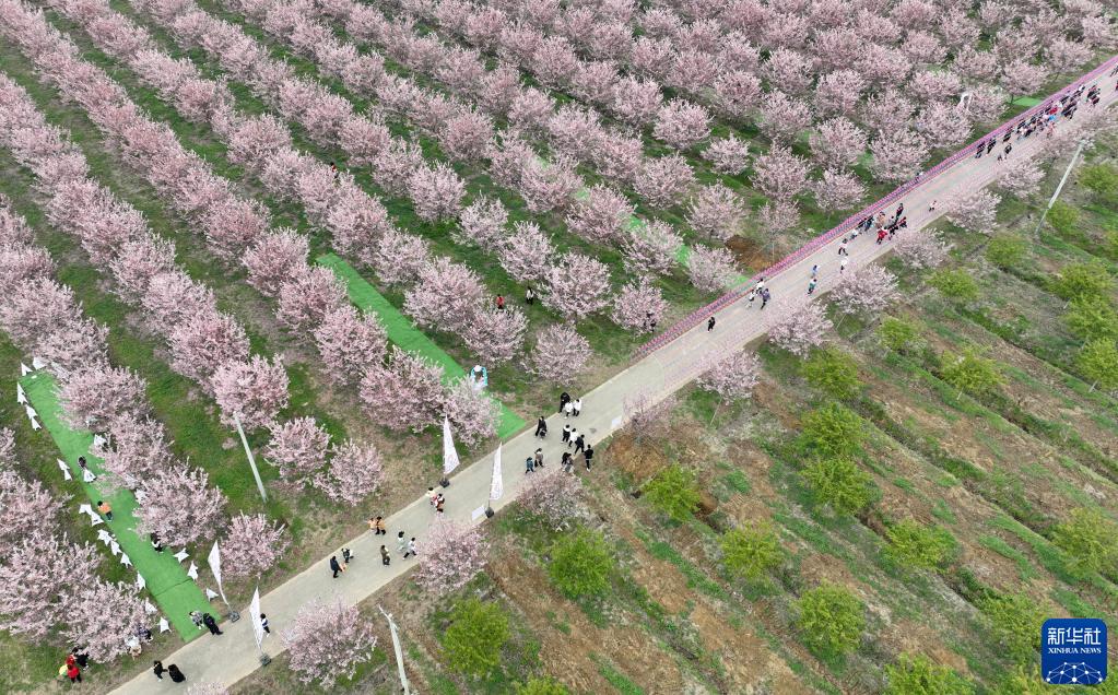 3月18日,游人在全椒縣馬廠(chǎng)鎮龍山櫻花園游玩(無(wú)人機照片)。