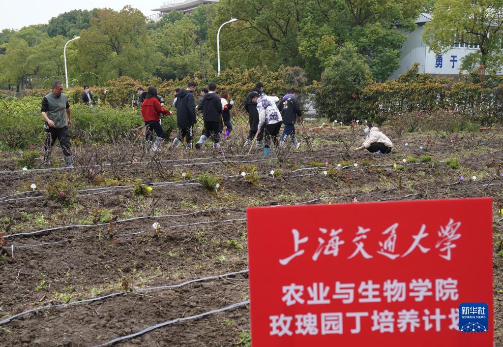 3月18日,上海交通大學(xué)的學(xué)生在老師的指導下學(xué)習玫瑰栽培養護。