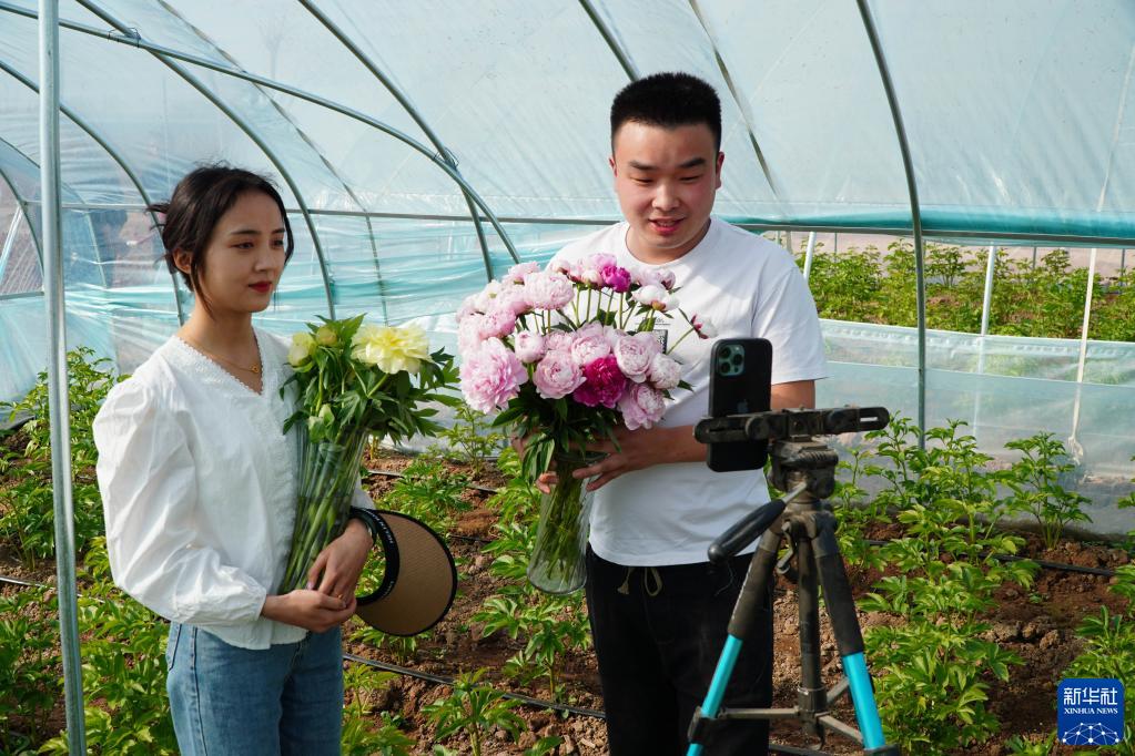 3月14日,在山東省菏澤市牡丹區黃堽鎮,兩名銷(xiāo)售芍藥鮮切花的電商主播在芍藥種植大棚內進(jìn)行網(wǎng)絡(luò )直播銷(xiāo)售。