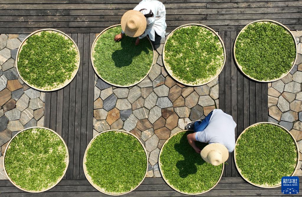 3月15日,在湖南省衡陽(yáng)市衡東縣白蓮鎮小初茶場(chǎng),茶場(chǎng)員工在挑選攤曬春茶(無(wú)人機照片)。