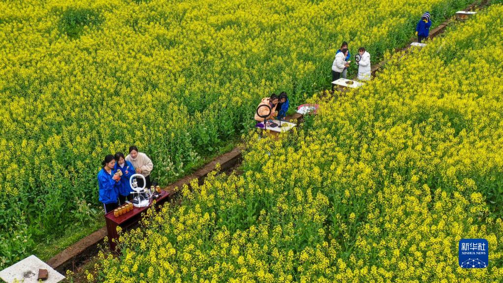3月18日,岑鞏縣中等職業(yè)技術(shù)學(xué)校電子商務(wù)專(zhuān)業(yè)的學(xué)生在油菜花地里學(xué)習直播銷(xiāo)售蜂蜜(無(wú)人機照片)。