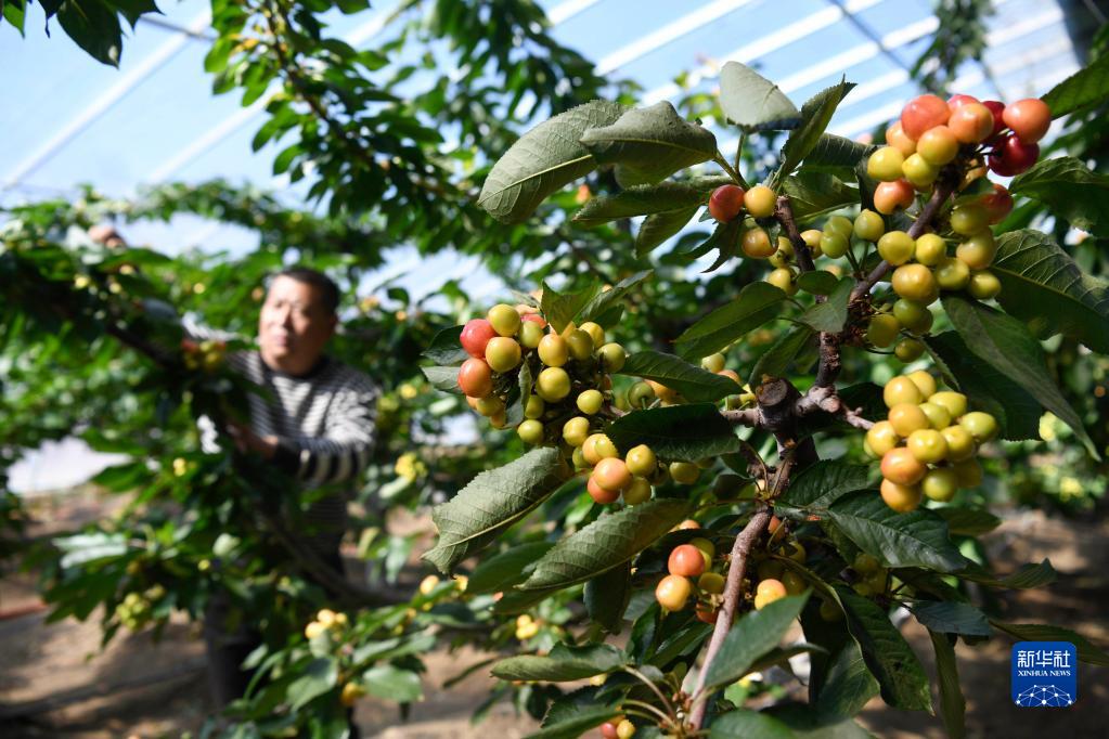 3月18日,在雙灤區大貴口村一處大棚,農民管護進(jìn)入成熟期的櫻桃。