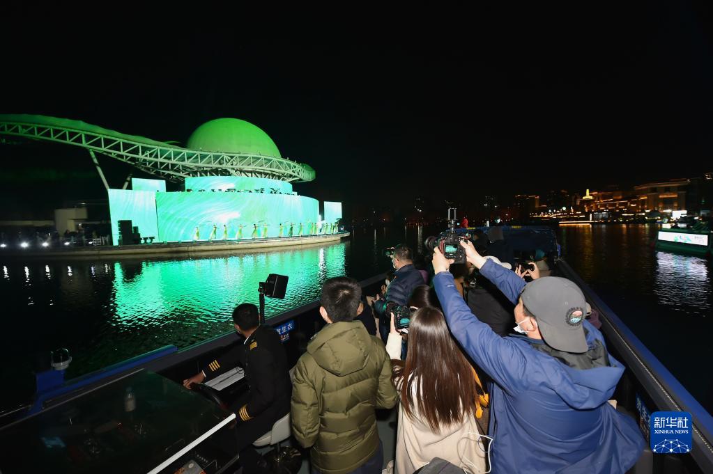 3月18日,人們在亮馬河游船上欣賞演出。