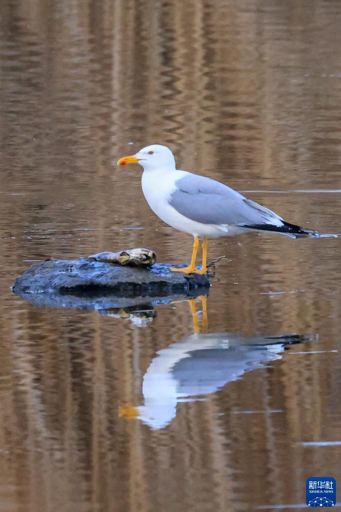 一只黃腳銀鷗在新疆博斯騰湖畔覓食(3月17日攝)。