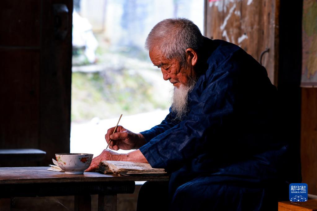 3月10日,水書(shū)先生潘秀業(yè)在家中書(shū)寫(xiě)水書(shū)文字。