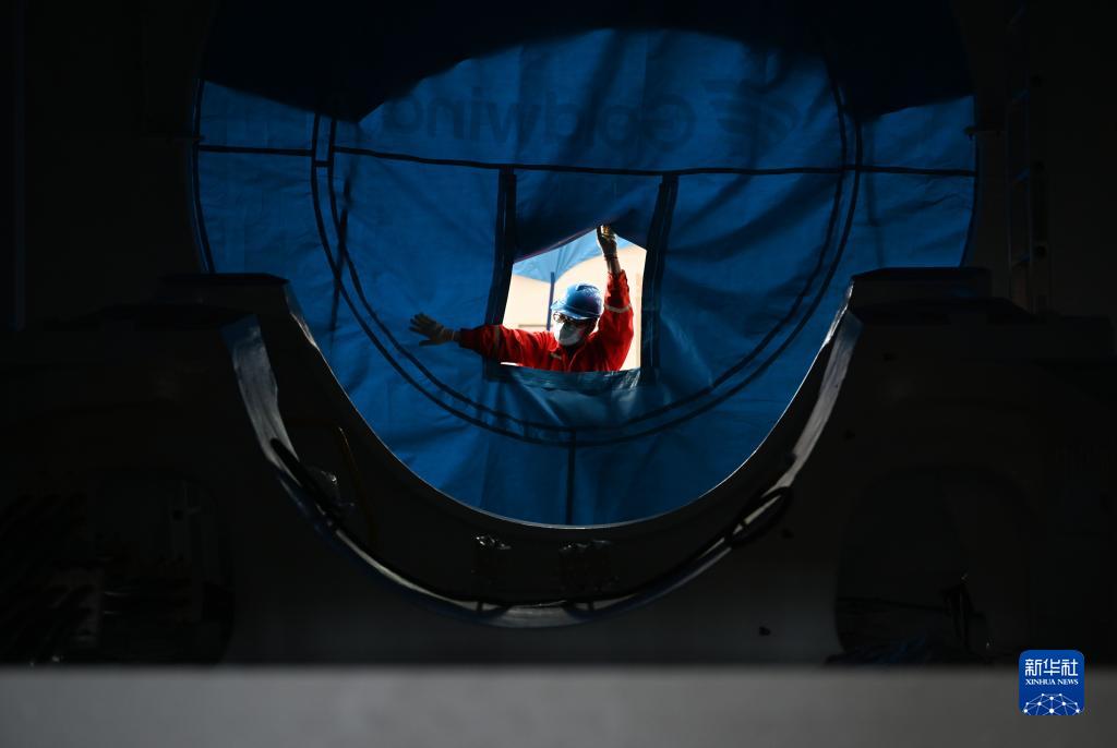 3月19日,工人在風(fēng)電車(chē)間裝配機艙。