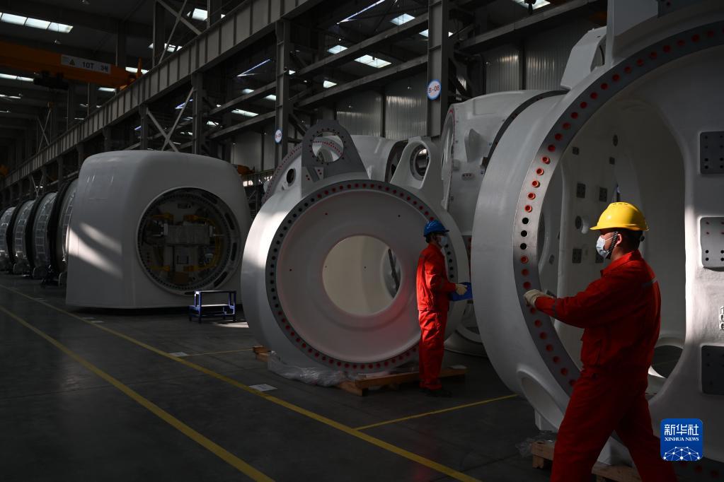 3月19日,工人在風(fēng)電車(chē)間裝配機艙。