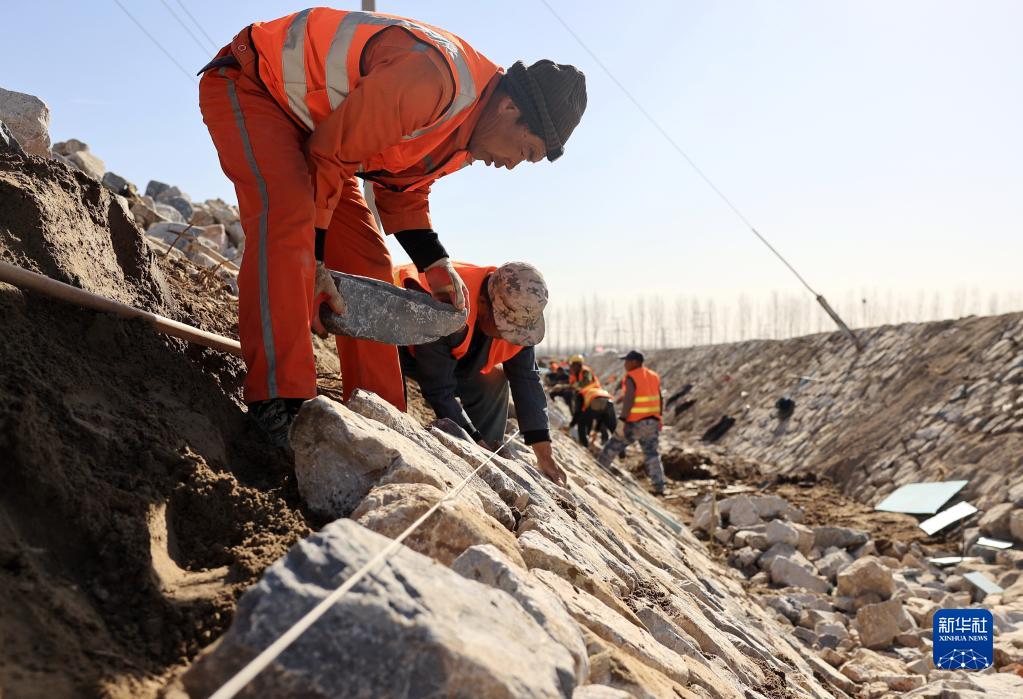 3月19日,工人在唐山市豐南區西葛鎮東尖坨一村高標準農田灌溉水渠改造工地施工。
