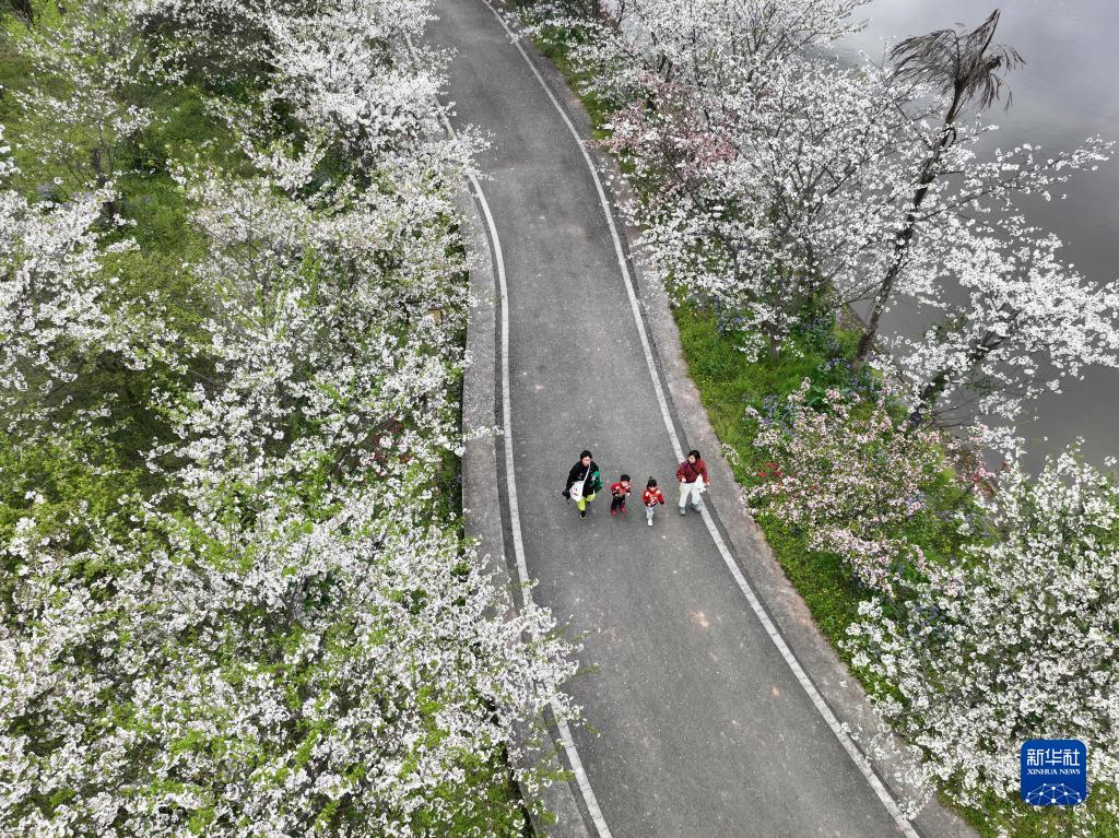 3月19日,游人在重慶市北碚區澄江鎮五一村“櫻花橘香”農業(yè)公園觀(guān)賞櫻花(無(wú)人機照片)。