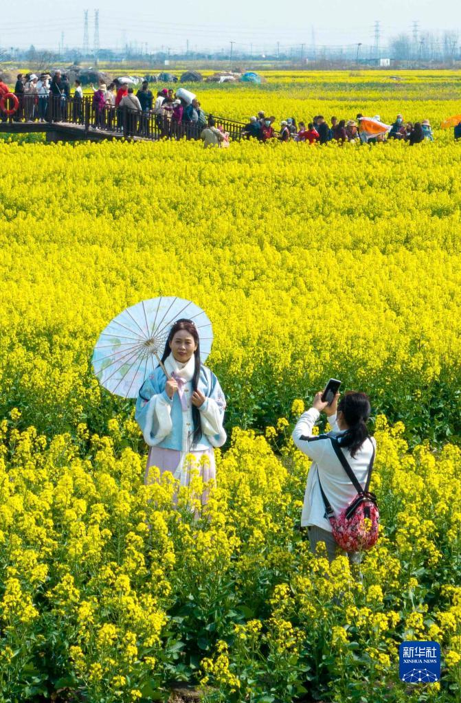 3月19日,游客在江蘇興化千垛菜花風(fēng)景區賞花拍照(無(wú)人機照片)。