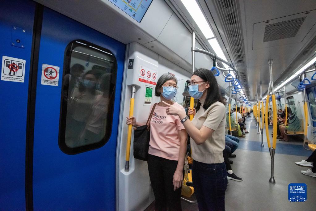 3月16日,在馬來(lái)西亞吉隆坡,中國中鐵東方隧道有限公司環(huán)境經(jīng)理朱文映與母親一同乘坐MRT 2線(xiàn)路首發(fā)列車(chē)。