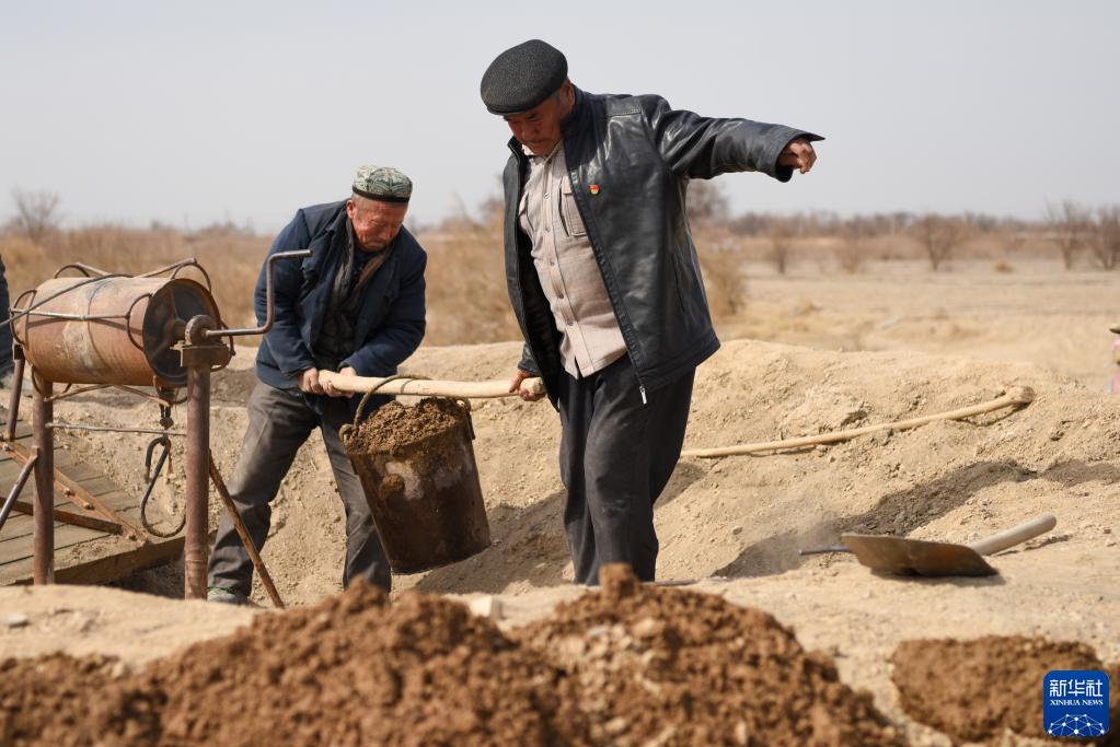 在新疆吐魯番市高昌區艾丁湖鎮附近的戈壁灘,花園村掏撈隊的隊員傾倒坎兒井內掏出的淤泥(3月9日攝)。
