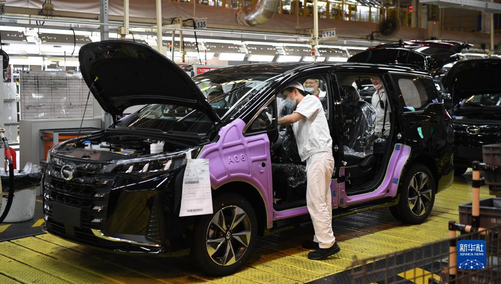 工人在廣州的廣汽傳祺智慧工廠(chǎng)總裝車(chē)間生產(chǎn)線(xiàn)上工作(3月20日攝)。